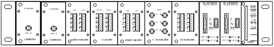 每臺機箱后面板配有2塊輸入模塊,2塊電源模塊,5塊輸出模塊和1個告警模塊;