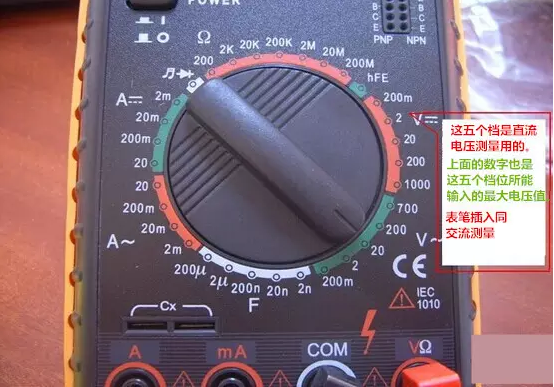 2、功能旋轉開關打至V~(交流),V-(直流),并選擇合適的量程 。