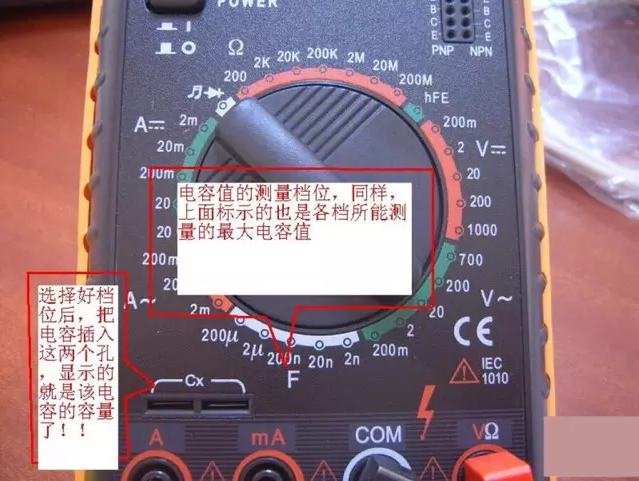 3、將電容插入萬用表C-X插孔。