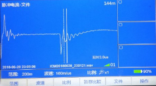 根據(jù)測(cè)試情況選擇黃地打壓,升高電壓至20KV時(shí)擊穿放電,用脈沖電流測(cè)得故障位置在144米左右。距離對(duì)端比較近。